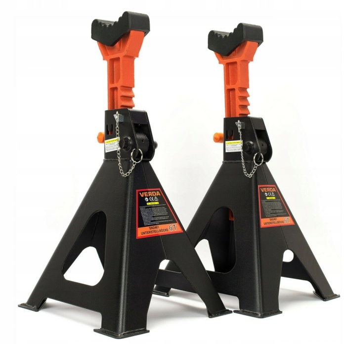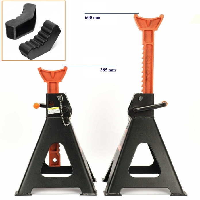 Zestaw dwóch podpór samochodowych o udźwigu 6T z blokadą zabezpioeczającą i gumą ochronna.