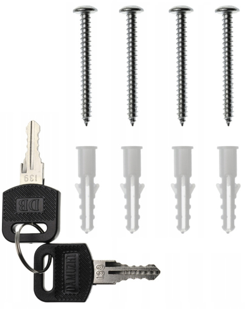 Kołki rozporowe ze śrubami do montażu (4 szt.) oraz dwa klucze w zestawie.